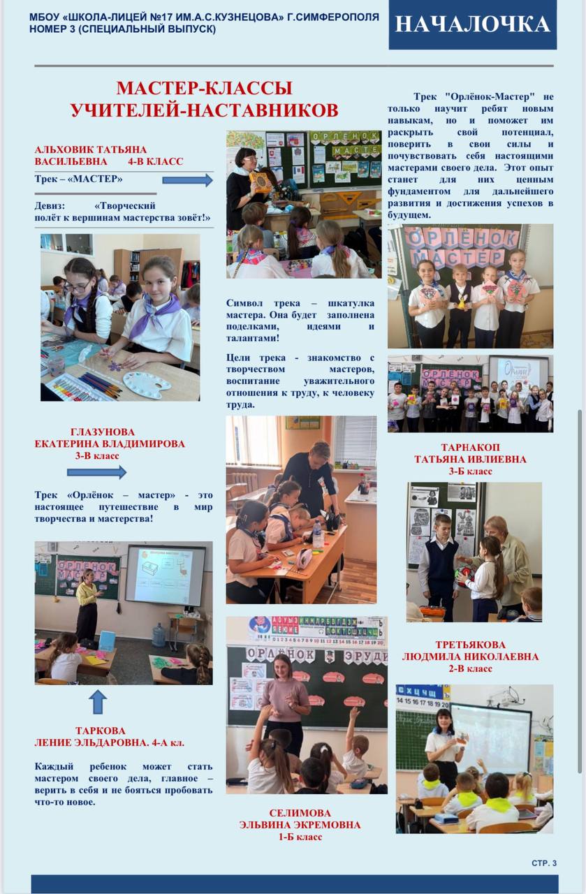 С 24.11.2025 по 28.11.2025 в МБОУ «Школа-лицей №17 им.А.С.Кузнецова» г.Симферополя прошла тематическая неделя «Орлята России». Читайте об этом в газете «Началочка» (специальный выпуск). А закончилась неделя торжественной церемонией посвящения первоклассников в «Орлята России». Организаторы мероприятия – заместитель директора по УВР Артамонова Л.А. и руководитель ШМО учителей начальных классов Альховик Т.В.